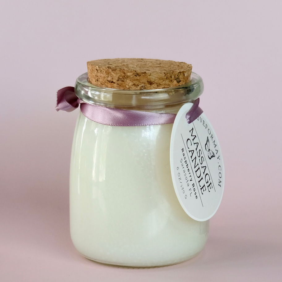 Handmade 6 oz body oil candle. The melted wax can be used as a massage oil or a moisturizer. Raspberry Rose is a soft, romantic blend of Rose, Mimosa, Raspberry, Vanilla, and Amber. The perfect addition to your daily self care routine.